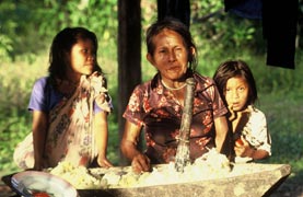 Histoire Les premières traces du peuple Sapara dans l’histoire de la conquête des Amériques remontent au début du XIXéme siècle. A cette époque, la plus grande partie de la forêt amazonienne a déjà été explorée. Aux sources de l’Amazone, certains peuples ont été repérés comme étant particulièrement mobiles dans la forêt et fuyant tout contact avec l’Homme Blanc. Au sud du Napo, par manque d’informations à leur sujet, on les nommera indifféremment « Aucas » ou « Saparas », alors qu’en réalité, ils forment une myriade de cultures différentes : Arabela, Andoa, Taïgiri, Huaorani, Sapara, Cahuarano, etc. Le boum du caoutchouc va décimer ces ethnies dans des proportions diverses, si bien que très tôt on parlera du mystère de la disparition des Sapara. Etaient-ils réellement 20.000 ? Ou bien ce chiffre correspond-il à l’ensemble des ethnies précédemment évoquées ? Nul ne pourra jamais répondre à cette question. En tout cas, au début du XXéme siècle, les Arabela et les Cahuarano ont déjà disparu. En ce même moment, les pères franciscains tentent de rassembler les familles Sapara dispersées, notamment en les arrachant aux peones, ces marchands métis qui continuent d’utiliser les Indiens comme des esclaves. En 1910, ils créent une reduccione, sorte de village-internat proche du modèle jésuite, à Santa Rosa, dans l’actuel territoire Sapara, un peu en amont de la confluence des fleuves Conambo et Pindoyacu. Ce qui devait devenir un modèle de protection des Indiens se changea en catastrophe humanitaire. Dans les années 1920, une épidémie de rougeole tua en une année au moins 3.000 Sapara, peut-être beaucoup plus selon les dires des anciens. Vers 1960, une douzaine de famille Sapara vivent loin de tout contact avec le monde moderne sur le fleuve Conambo : la guerre entre le Pérou et l’Equateur les a séparé. Côté équatorien, certains Indiens évitent scrupuleusement tout contact avec les militaires ; plusieurs familles préférant s’enfoncer dans la forêt en direction du nord (vers le fleuve Curaray). On pense même que quelques unes de ces dernières se seraient unies avec les Taïgiri, unique ethnie d’Equateur non encore contactée. Dans les années 70, les premières prospections pétrolières vont totalement bouleverser ce fragile équilibre. Des Indiens Quichua puis Shiwiar du fleuve Bobonaza sont recrutés pour contacter les Sapara. On leur offre de travailler pour certaines compagnies pétrolières, en leur proposant de former -notamment- le village de Conambo. Dix ans plus tard, ces compagnies se retirent, les prospections se sont avérées concluantes. Il sera nécessaire d’attendre qu’une route se construise pour exploiter ces gisements. Elles laissent derrière elles un territoire désormais multi-ethnique et dominé par la langue Quichua. Ce sera le début du déclin de la langue Sapara, qui n’est plus enseignée. Les Sapara aujourd’hui Sur le plan sociopolitique, les Indiens Sapara sont peu nombreux et insuffisamment organisés, surtout si on les compare à leurs voisins Quichua (60.000), Shuar (60.000) et Achuar (8.000) : on compte 1.300 Indiens (chiffres 2009) répartis en 17 communautés : Conambo (le plus gros village), Llanchamacocha, Torimbo, Masaramu, Jandiayacu, Alto Corrientes, Imatiño Katerica, Tsuraka, Shiona, Nuevo Amazonas, Garcayacu,.Cuyacocha, Chuyayacu, Pindoyacu, Pumayacu, Balsaura, Wiririma. A titre indicatif, seuls deux d'entre eux ont le baccalauréat. Les territoires Sapara, représentés par deux organisations autochtones en cours d’unification (NASAPE et NAZAE), ne comptent que 1.070 Indiens (chiffres Juin 2004) répartis en 14 communautés : Conambo, Llanchama Cocha, Torimbo, Alto Corrientes, Shiona, Pindoyacu, Masaramu, Balsaura, Pumayacu, Cuyacocha, Jandiayacu, Wiririma, Chuyayacu, Inataño Katerica. Ils sont parmi les plus pauvres d'Amazonie. Vivant encore en autarcie, sans aucune production agricole exportée à l'extérieur de leur territoire si ce n'est la cannelle, le revenu moyen annuel par famille est estimé à seulement 100 $ US. De plus, les Sapara auront à subir l'avancée de la prospection pétrolière dans les prochaines décennies (Bloc 17). Rien n'a été fait pour consolider leur identité culturelle et leur aptitude à gérer ce type de problème. Seuls quelques programmes de santé ont été développés dans l'urgence. Un territoire, une chance inespérée pour les Sapara Le territoire Sapara1 est officiellement créé le 22/10/1992 par le gouvernement équatorien, sous la dénomination " Titulo de asentamiento tradicional Sapara ", suite aux événements nationaux ayant émaillés la commémoration des 500 ans de la découverte des Amériques par Christophe Colomb et qui fut transformée par les peuples autochtones, en une démonstration de force destinée à célébrer 500 ans de résistance. Ce territoire Sapara tel qu'il a été délimité par le gouvernement équatorien est, avec le Parc Yasuni dans la province du Napo, la zone la plus marginale d’Equateur et à ce titre, possède l'une des plus fortes biodiversité du monde. Trois raisons à cela : -- Ce territoire n'est accessible que par avion après 50 minutes de vol. A l'Est, la route la plus proche se trouve à 120 kms (7 jours de marche). A l'Ouest, malgré le récent règlement du conflit entre Equateur et Pérou (1995), la frontière reste fermée et empêche toute communication par voie fluviale vers le sud-ouest. -- Aucun grand fleuve ne traverse ce territoire. Le Rio Conambo est navigable seulement à partir de Conambo et le Rio Pindoyacu à partir de Chuyayacu. A noter que l'union de ces deux fleuves à la frontière donne le Rio Tigre, l'un des principaux affluents de l'Amazone. -- Sa densité de population est inférieure à 0,2 habitant/km² depuis au moins 80 ans, ce qui conduit à une faible pression sur le biotope (densité équivalente à celle des populations ancestra